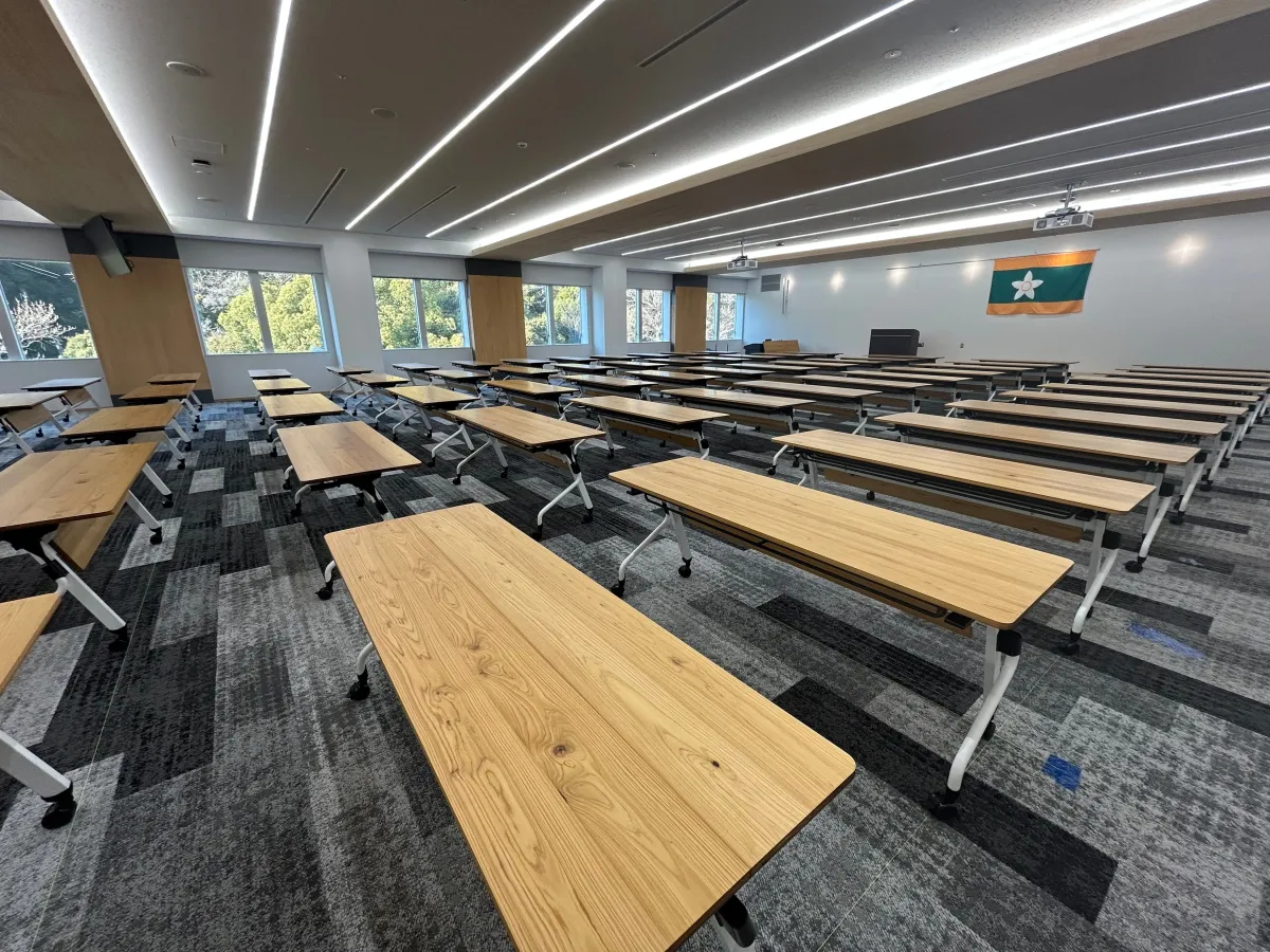 設置された会議テーブルは、会議室の雰囲気を一層引き立て、県庁内での会議や交流が、より和やかなものになることでしょう。このような美しいデザインは、愛媛県産の高品質なヒノキ材が持つ特性を生かしているからこそ実現できています。