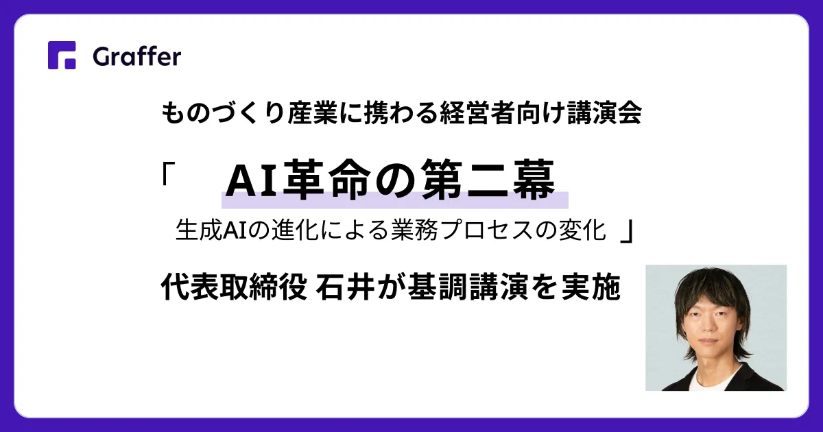 2025年1月30日、東京都台東区で開催された「2025年ものづくりなでしこ 新年会」において、株式会社グラファーの代表取締役を務める石井大地氏が基調講演を行いました。本講演のテーマは「AI革命の第二幕 もっと欲望を語り合おう」。石井氏は、生成AIの進化がもたらす業務プロセスの変化や、それに伴う企業のデジタル化について解説しました。