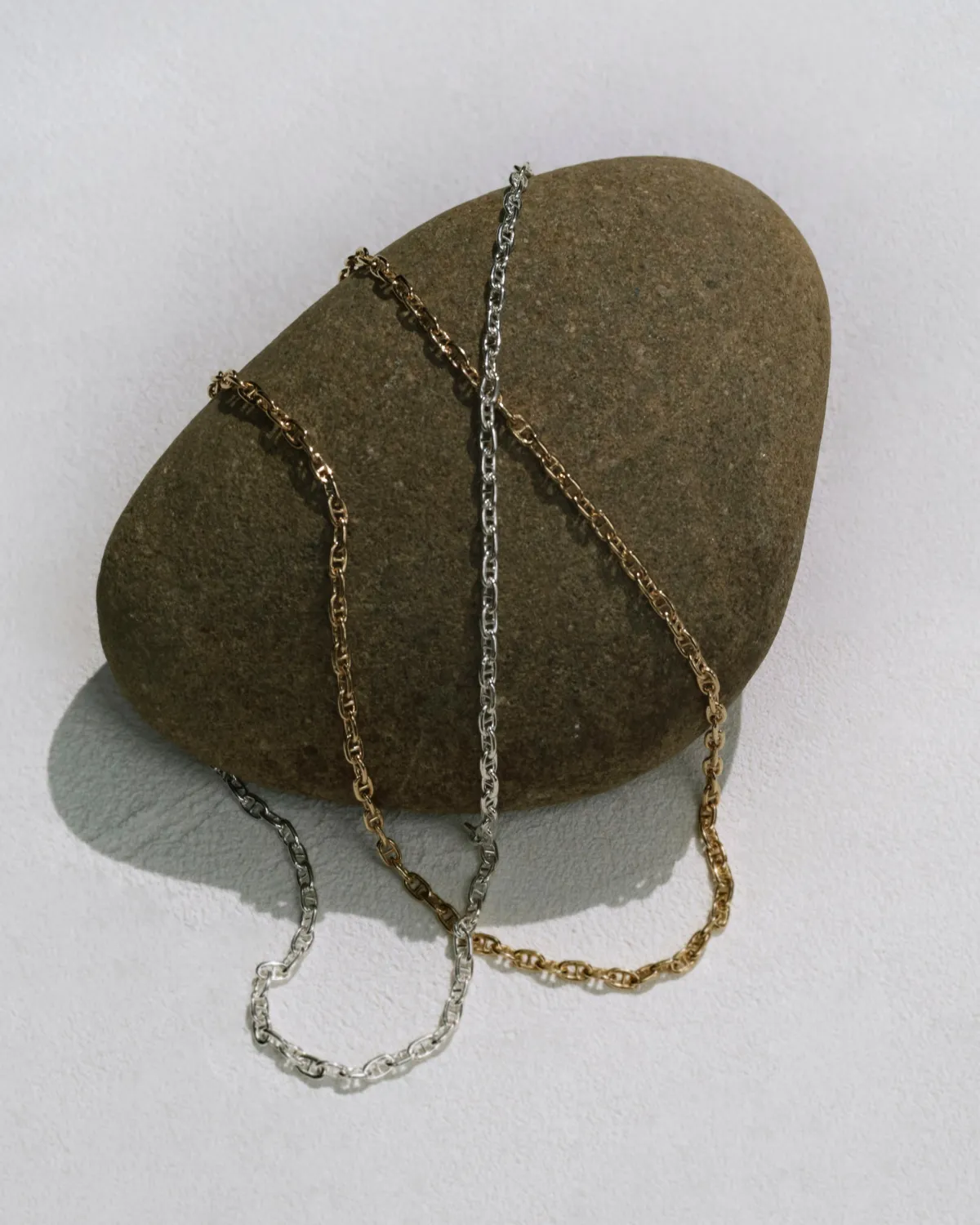 新作の『ポートチェーン』シリーズは、船と錨を繋ぐアンカーチェーンをデザインのインスピレーションにしています。このシリーズのネックレスは、SV925素材を使用したモデルで、スタイリッシュなθ型のコマが連なる普遍的なデザインが特徴です。使いやすさにこだわったカニ手留め具やオリジナル型のエンドプレートが施されており、細部まで丁寧に仕上げられています。