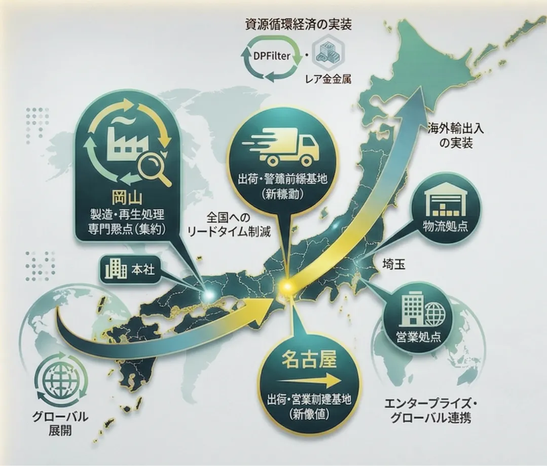 次の灯株式会社は、商用車から取り外される廃棄部品の「DPFフィルター」と「SCR触媒」を用いて、希少金属を回収し、環境問題に取り組む新しいビジネスモデルを展開しています。この度、2026年4月に名古屋で新たな拠点が正式に稼働し、岡山での製造拠点との連携を強化しています。