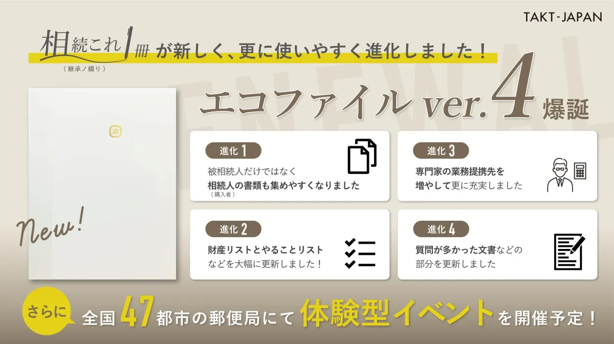 株式会社TAKT-JAPANが運営する新しい相続サポートファイル「相続これ1冊(継承ノ綴り)エコファイルver.4」が、2025年9月22日から発売開始となります。この商品は、個人が手軽に相続手続きに取り組めるように設計された特許取得済みのファイルです。ユーザーからのフィードバックをもとに、従来のver.3からの進化が期待されています。