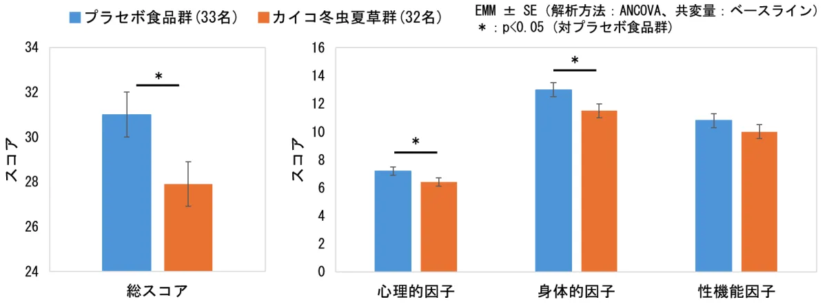 本研究では、68名の40歳以上の男性を対象とし、カイコハナサナギタケ冬虫夏草もしくはプラセボを12週間摂取するランダム化対照試験が実施されました。評価には、男性更年期障害質問票(AMSスコア)が用いられ、総スコアに加え、心理的および身体的因子でも有意な改善が認められました。