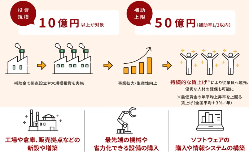 この補助金は、地域の雇用を支えるために設定されており、生産設備だけでなく、工場や物流施設といった建造物への投資にも適用されます。補助金の上限は最大50億円で、補助率は1/3と非常に魅力的です。特に、2024年には2回の公募が実施される予定です。詳細は当社の専用サイト「補助サポ」で確認できます。