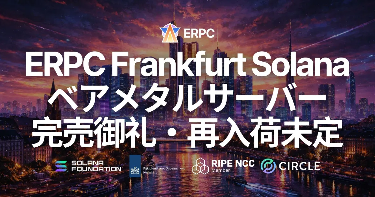 ERPCが提供するフランクフルトリージョンのSolanaアプリケーション用ベアメタルサーバー「SLV Metal APP+」や「Metal Premium APP」「Metal Premium APP+」が完売したことをお知らせします。この情報は、多数のお客様からのご要望に応じて発表されました。現時点では再入荷の見込みはなく、今後の供給については限られた形での対応となる見通しです。