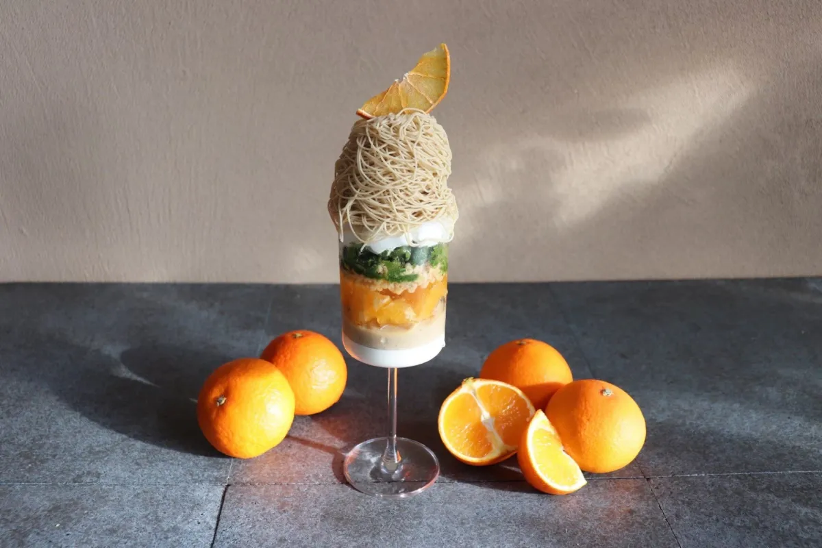 このパフェは、希少な果実「紅まどんな」を使用。甘みと酸味のバランスが絶妙で、とろけるような食感が特徴です。和栗のモンブランと合わせることで、層ごとに異なる味わいが楽しめる贅沢な一品に仕上がっています。