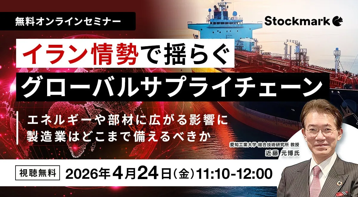 ストックマーク株式会社は、2026年4月24日(金)に「イラン情勢で揺らぐグローバルサプライチェーン ― エネルギーや部材に広がる影響に製造業はどこまで備えるべきか」というテーマのオンラインセミナーを開催します。このセミナーでは、製造業が直面しているサプライチェーンの不確実性について考察し、特にイラン情勢がどのような形で影響を及ぼすのかを深掘りします。