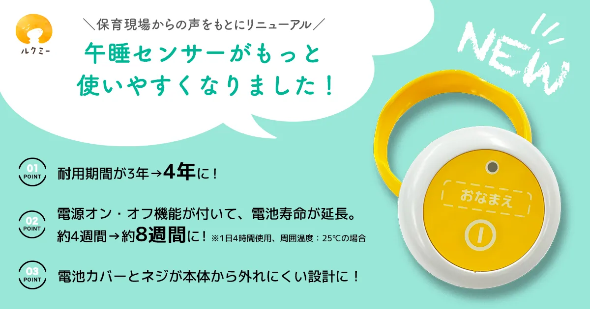 毎年発生する保育施設での死亡事故は特に午後の昼寝の時間帯に多く見られ、そのためユニファは2018年に「ルクミー午睡チェック」を開発。このシステムは、乳幼児の胸元に取り付けたセンサーが体動を感知し、専用のアプリが体位を自動記録する仕組みで、保育者が確認する際の負担を軽減する。これまでのモデルは約6年の使用を経て、現在では日本全国の数多くの保育施設で用いられ、業界シェアはトップに立っている。