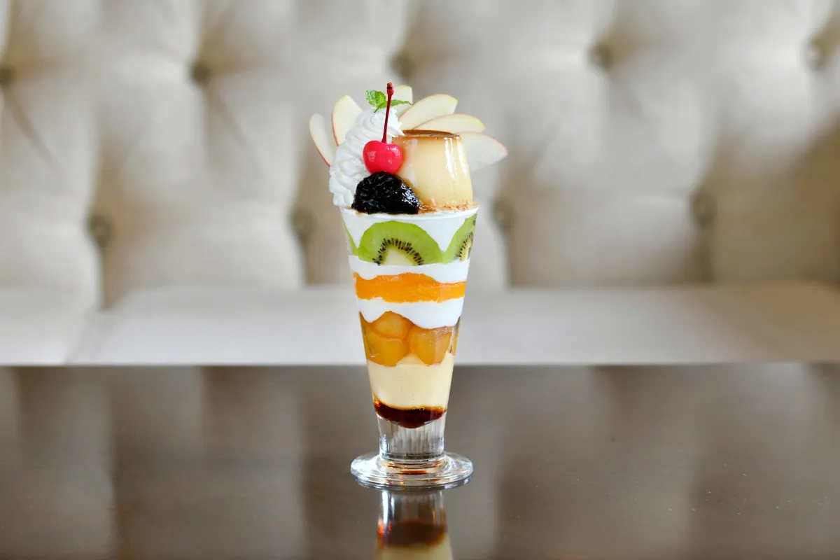 新しい「プリン・ア・ラ・モード パフェ」は、華やかなビジュアルとともに魅力的な味わいを楽しむことができます。特徴的なのは、花びらのように盛り付けられたりんご。自家製のプリンがトップにあしらわれ、クリームやプルーン、さくらんぼと共に飾られています。ピリッとしたバニラアイスクリームおよび生クリーム、さらにフルーツを幾重にも重ねて、見た目だけでなく口触りや風味にもこだわった一品です。