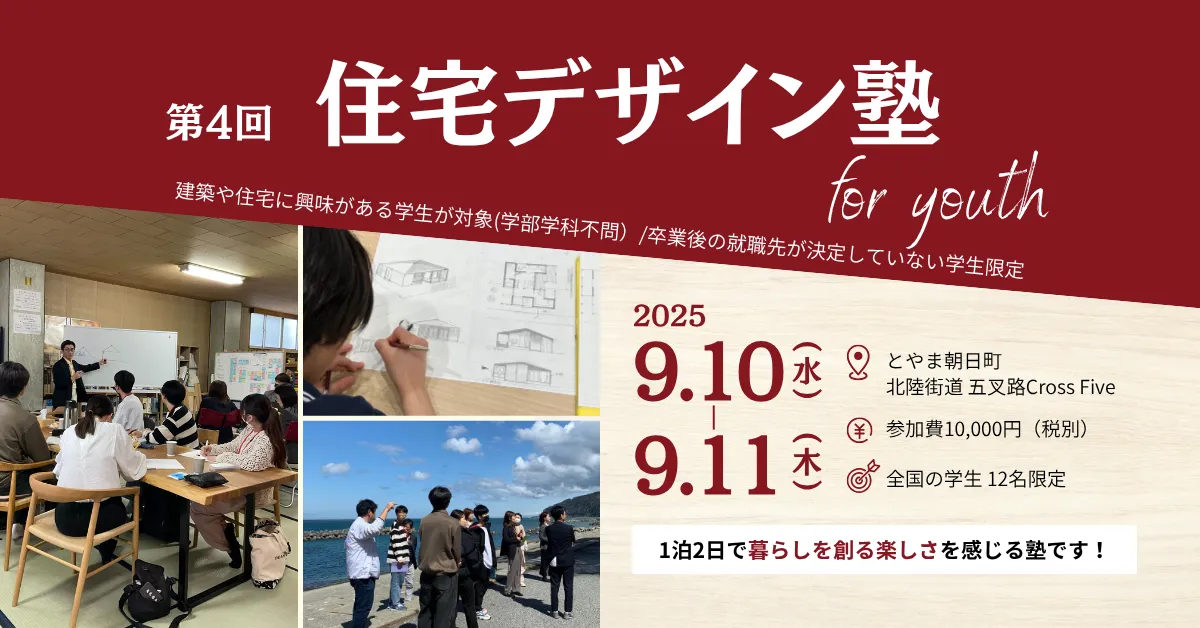 「住宅デザイン塾 for youth」は、2025年9月に富山県での開催を予定しています。参加希望者には、宿泊施設や交通手段、参加費用の詳細が明示され、早めの申し込みが推奨されています。