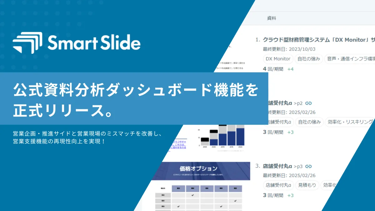 株式会社スマートスライドは、東京都新宿区に本社を置く企業で、特に提案営業の場での資料管理をデジタル化する解決策「SmartSlide」を提供しています。この度、提案資料の質と速度を劇的に向上させる新機能「公式資料分析ダッシュボード」を正式にリリースしました。
