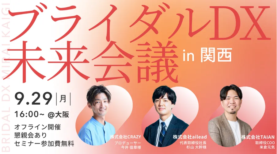 2025年9月29日、株式会社TAIANが主催する「ブライダルDX未来会議」が大阪で開催されます。本イベントには、商談解析クラウド「ailead」を展開する株式会社aileadの代表取締役社長、杉山大幹氏が登壇します。近年、ブライダル業界はCOVID-19の影響から新たな課題に直面していますが、その解決策としてデジタル技術やAIの導入が進む中、業界のリーダーたちが一堂に集い、未来のビジョンや事例を共有する重要な機会となります。