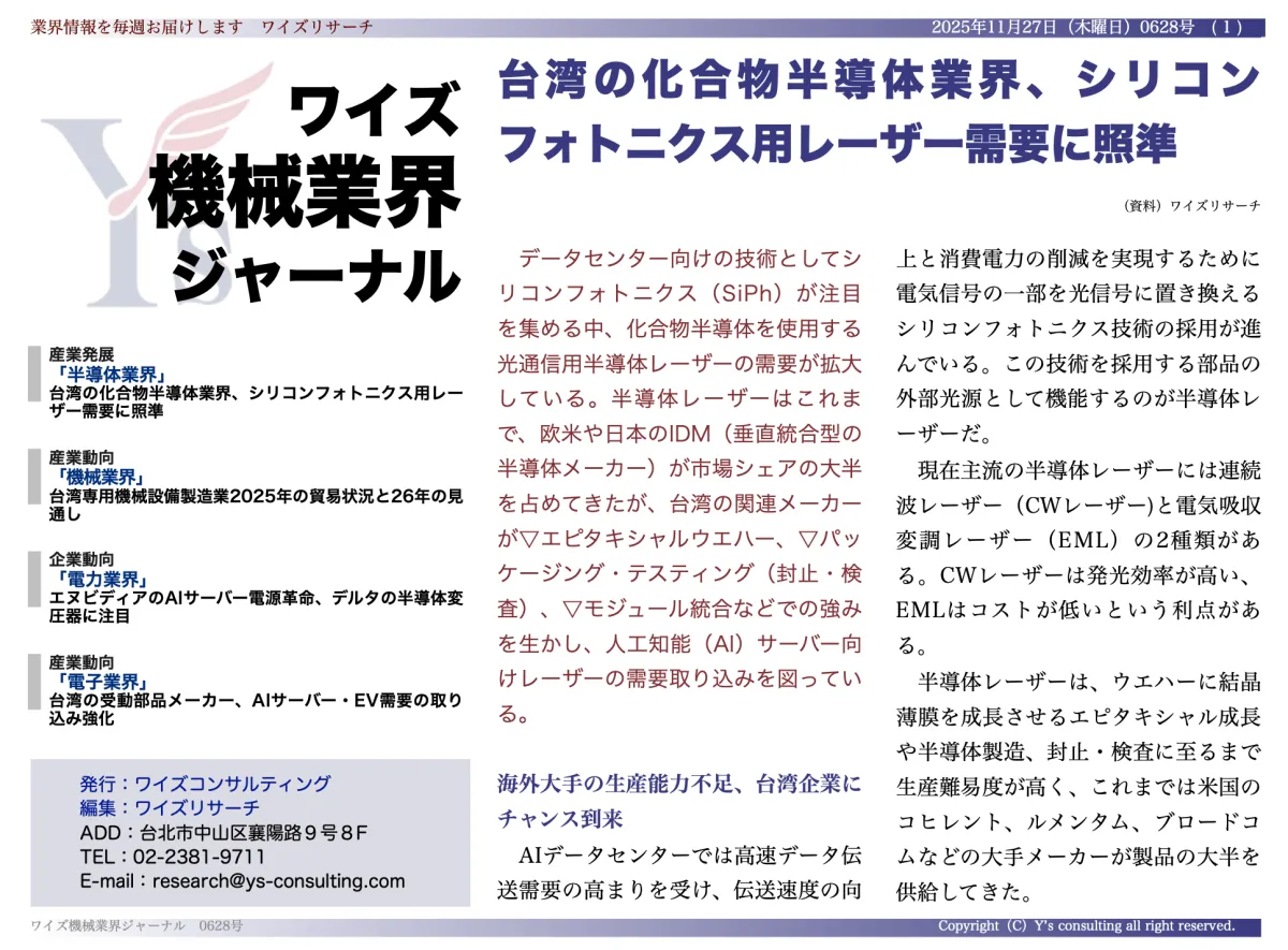 台湾の化合物半導体業界がシリコンフォトニクス用レーザー需要に焦点を当て、急速な成長を遂げています。特に、AIデータセンターの拡大がこの動きを後押ししており、従来の欧米企業への依存から脱却する姿勢が見られます。台湾の主要企業である聯亜光電、華星光通、全新光電が、InP(インジウムリン)半導体レーザー市場で存在感を増しています。