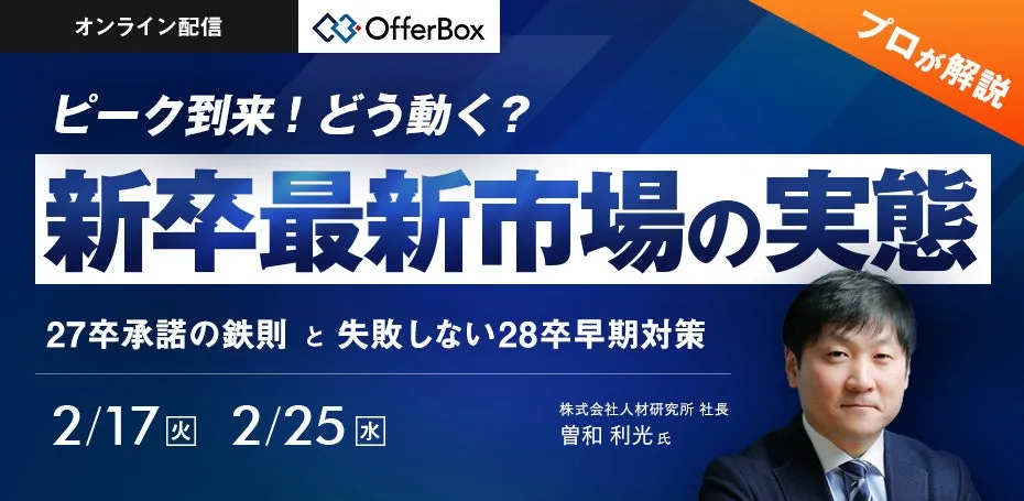 株式会社i-plugが運営する新卒オファー型就活サービス「OfferBox」は、2026年の新卒採用戦略に関するオンラインセミナーを開催します。このセミナーでは、株式会社人材研究所の曽和利光社長が登壇し、新卒採用市場の最新データに基づいた戦略や、2026年卒業予定者に対する具体的なアプローチを解説します。彼の豊富な経験と専門知識を基に、採用市場の動きが活発になる3月から6月に向けての効果的な戦い方を学ぶ貴重な機会です。