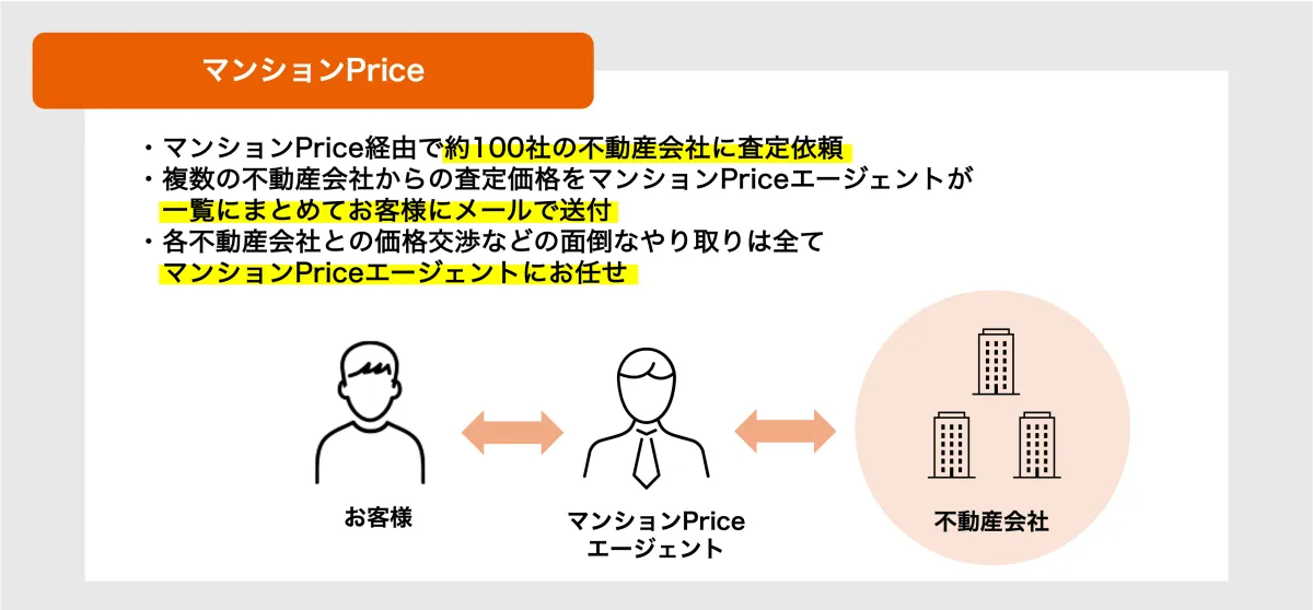 査定サイトを利用する際の一般的なデメリットには、「査定を依頼した翌日から複数の不動産会社から営業の電話がかかってくる」、「営業マンからの強引な営業に困惑する」、「査定価格を知りたいだけなのに、無理に売却を勧められる」などの悩みがあります。しかし、マンションPriceでは、オーナー様の代理としてこういったやりとりをすべて引き受けるため、ストレスなく査定結果を得ることができます。