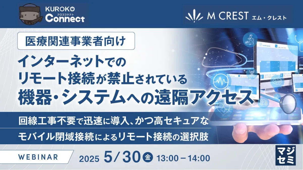 このウェビナーでは、モバイル回線の効果的な利用法や、モバイル閉域接続を使用したリモートアクセスの利点、導入手法について具体的なプランをお伝えします。また、医療施設内での機器やシステムの安全で効率的な運用を可能にする選択肢についても詳しく解説します。
