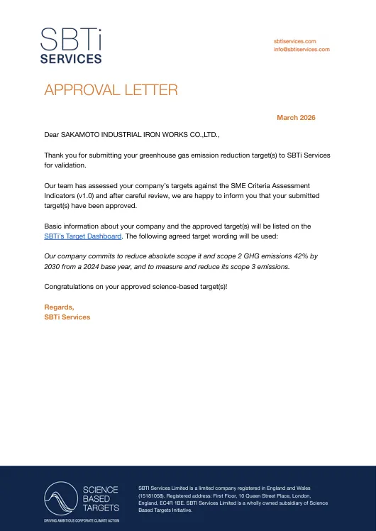 SBTとは「科学的根拠に基づくターゲット」の略で、企業が設定した気候目標の科学的整合性を評価する枠組みです。坂本工業が取得した中小企業向けの認定は、同社の温室効果ガス削減に向けた意欲と責任感を示しています。これにより、企業としての持続可能性を実現するとともに、地域社会にも良い影響を与えることを目指しています。