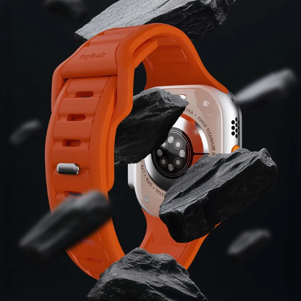 「ジャーニー ウォッチバンド」の大きな特徴は、超高耐久のFKM(フッ素エラストマー)素材です。この素材は、過酷な条件に耐えられる強靭な耐久性を誇り、汗や水、紫外線からも保護されます。これにより、さまざまなアウトドアシーンやスポーツ活動にも適した装着感が得られます。