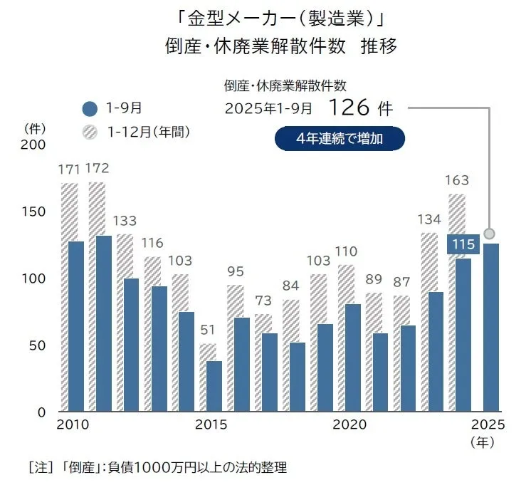 日本の「モノづくり産業」を支える重要な役割を果たす金型産業が、今、深刻な危機に直面しています。株式会社帝国データバンクが発表したデータによると、2025年の1月から9月にかけて、金型メーカーの倒産数は36件、休廃業・解散が90件と合計126件に達しました。これは過去10年で最も多いペースであり、倒産と廃業の件数は4年連続で増加しています。