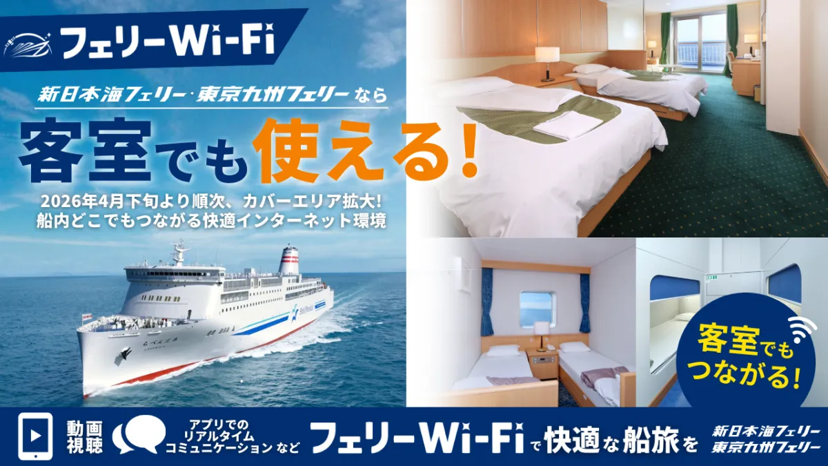 新日本海フェリー及び東京九州フェリーが、船上Wi-Fiサービス「au Starlink フェリーWi-Fi」の提供範囲を全客室へ拡大しました。これにより、乗客はエントランスホールやレストランだけでなく、各客室でも高速インターネットを利用できるようになります。