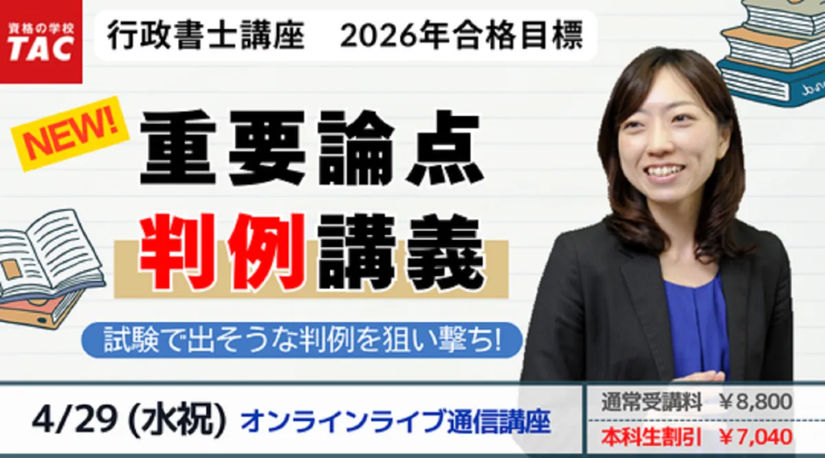 行政書士を目指す皆さん、試験対策は進んでいますか?TAC株式会社が提供する全国の学習者向けの講座は、今年度の試験に向けた重要な情報をお届けします。特に注目したいのが、2026年度合格をターゲットにした新講座『重要論点判例講義」です。この講義は、オンラインライブ形式で4月29日(水・祝)に開催予定で、全2回にわたって実施されます。
