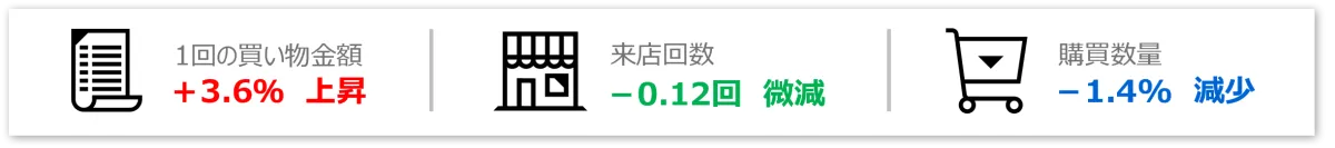 以上のデータから、買い物金額の上昇、購買数量の減少、来店回数の減少という3つの変化が同時に起きていることが浮かび上がります。これにより、消費者は必要なものを選択し、過剰な支出を避ける「節約行動」を実践していると考えられます。