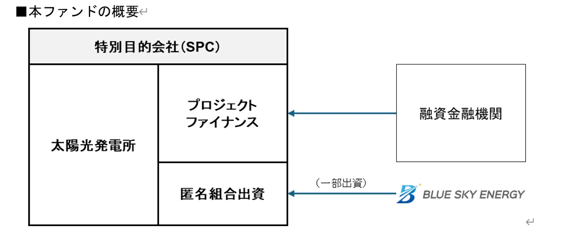 本ファンドは、特別目的会社(SPC)に対して融資を行う金融機関によるノンリコース型のプロジェクトファイナンスとして実施されます。また、ブルースカイエナジーをはじめとする関連会社からの資金供給も行われ、全国あわせて7.4MW規模のバルク型太陽光発電事業が展開される予定です。