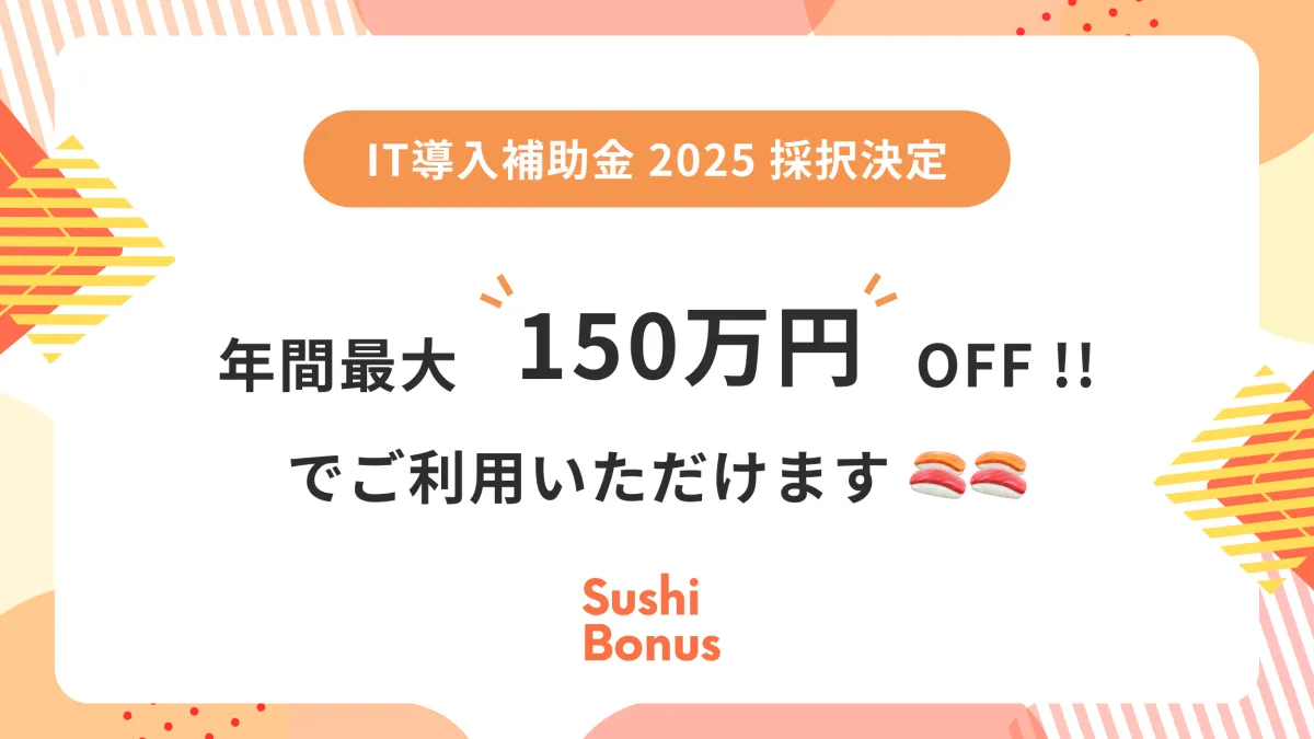 「IT導入補助金」は、中小企業と小規模事業者を対象にした制度で、業務の効率化や売上向上を目指している企業に対し、ITツール導入にかかる費用の一部を助成することを目的としています。補助金額は5万円から150万円未満で、年間利用料全体の1/2が支援対象となります。これにより、補助を受ける企業は「Sushi Bonus」を年間最大150万円の補助を受けて導入できることがわかります。
