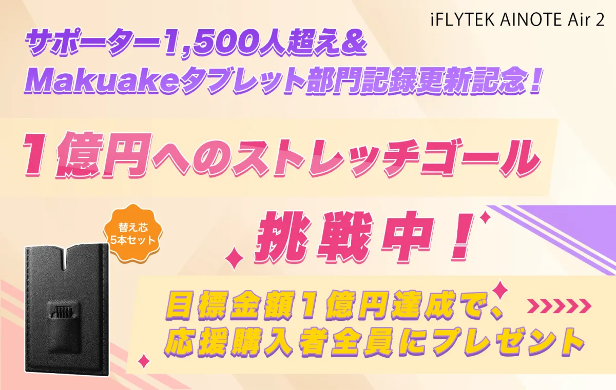 1月23日から始まったこの応援購入プロジェクトは、すでに多くの賛同を集めており、購入額は9,000万円を突破しています。これはMakuakeのタブレット部門での歴代最高金額を記録しており、この勢いを受けて、iFLYTEKは1億円というストレッチゴールに挑戦しています。この金額を達成した際には、応援いただいた全員に替え芯5本セットがプレゼントされる予定です。この特典は、一般販売予定価格1,980円(税込)相当です。