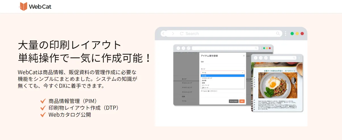 販促用のPOPやプライスカード、名札や案内状など、商品ごとに異なる印刷物を用意するのは手間がかかります。特に、商品が多いほどそれぞれのデザインや情報を整理するのは難しくなり、入力ミスが発生する恐れもあります。このような状況に応えるために、ノーコードで使いやすいインターフェースを持つ『WebCat』が登場しました。