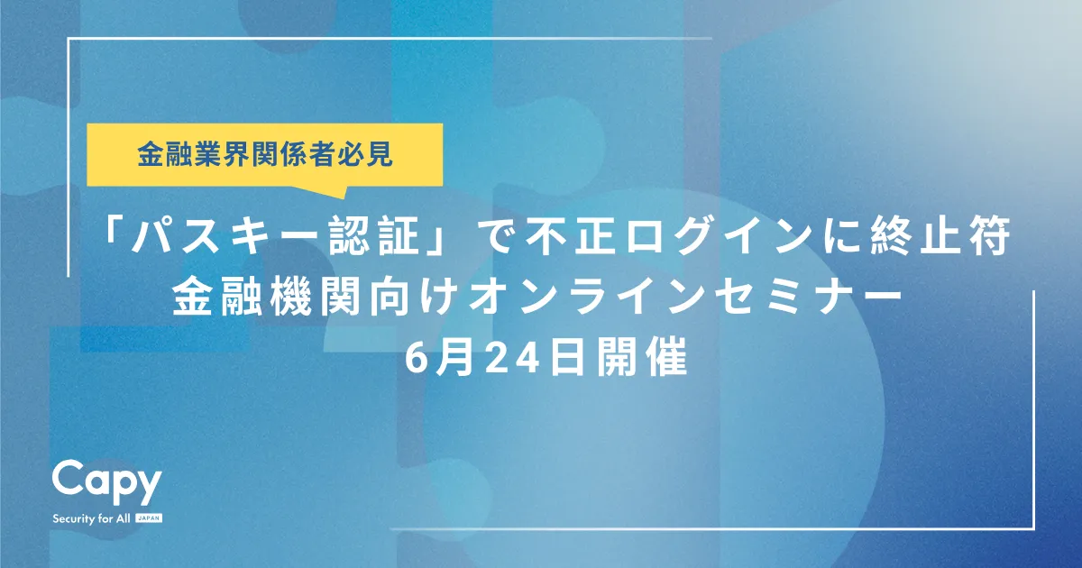 Capy株式会社が主催する無料オンラインセミナー「金融業界を揺るがすフィッシング被害、今こそ金融機関が『パスキー認証』を採用すべき理由」が2025年6月24日(火)に開催されます。このセミナーでは、金融機関を狙ったフィッシング攻撃の現状や、効果的な対策として注目されているパスキー認証の導入意義について詳しく解説されます。