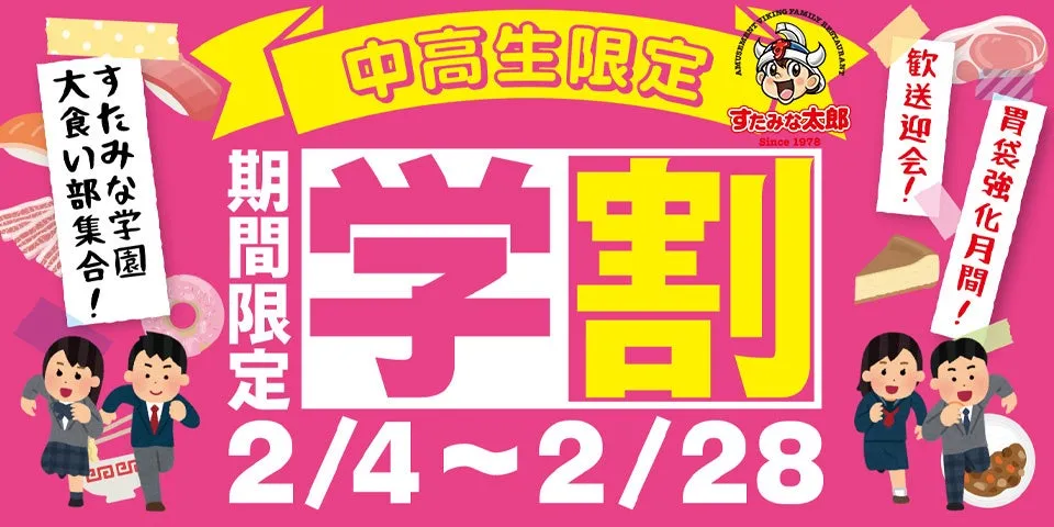 焼肉や寿司、スイーツが食べ放題の人気チェーン「すたみな太郎」が、2025年の2月4日から28日まで、特別なキャンペーンを実施します。この期間中は「中高生学割」と「アプリスタンプ5倍キャンペーン」という2つのお得なサービスが楽しめます。