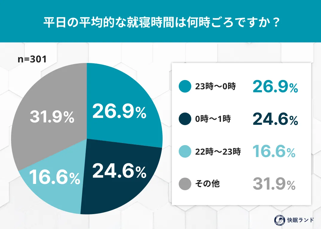 平日では、23時〜0時が最も多く、次いで0時〜1時が24.6%、22時〜23時が16.6%と続きます。深夜に寝る割合は1時以降で9%という結果です。