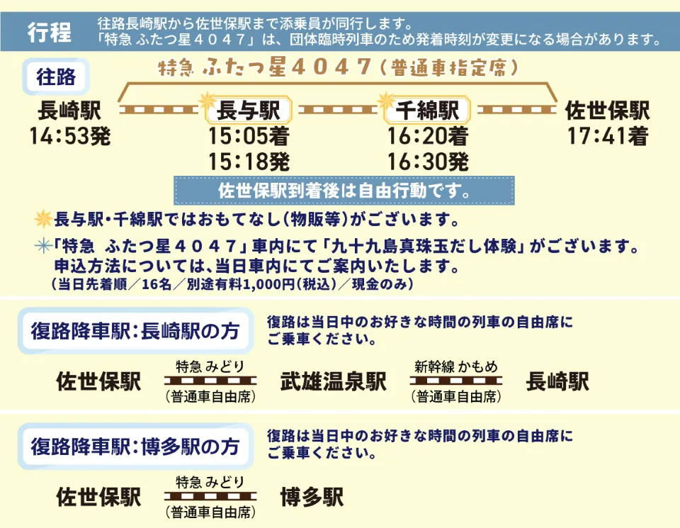 この特別運行ツアーは、佐世保と長崎の魅力を存分に味わえる貴重な機会。お酒やスイーツを楽しみながら、特急ふたつ星の旅を堪能しませんか?心より皆様のご参加をお待ちしております。
