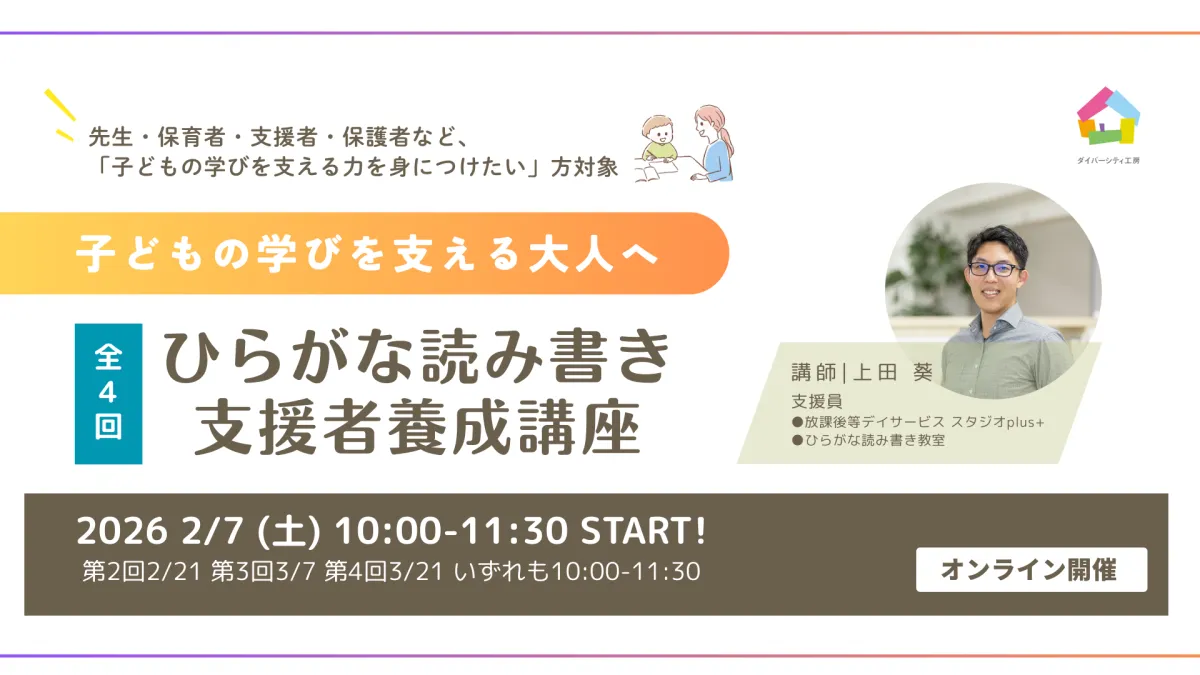 NPO法人ダイバーシティ工房が、2026年2月から全4回のオンライン講座「ひらがな読み書き支援者養成講座」を開催します。この講座は、幼稚園・保育園・小学校で働く先生や子どもに関わっている全ての大人を対象に、子どものひらがな読み書きに関する理解を深め、具体的な支援方法を学ぶことを目的としています。