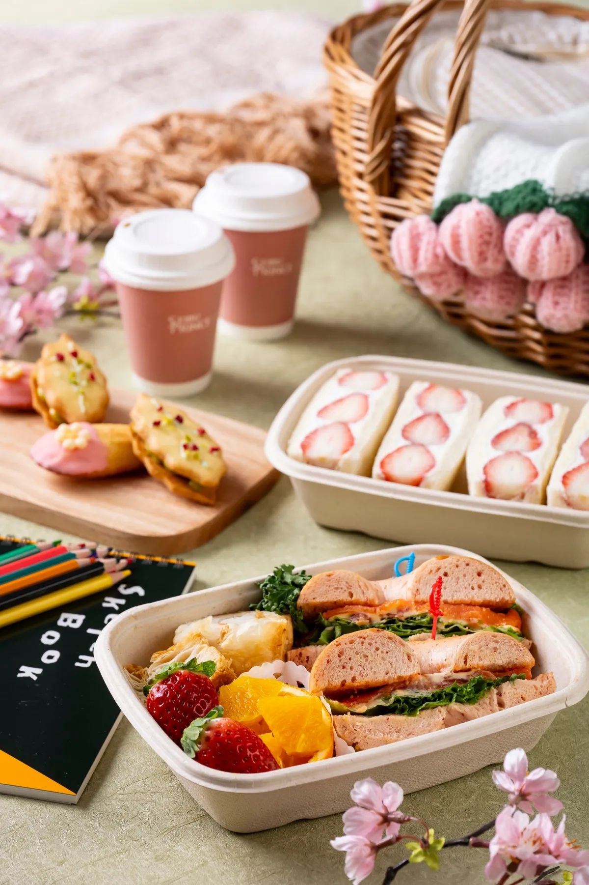 ピクニックセットには、滋賀県産のいちごを使用した華やかないちごのサンドウィッチや、地元名産の“えび豆”と“赤こんにゃく”を生地に練り込んだベーグルサンドなど、滋賀の味覚を心ゆくまでお楽しみいただけます。また、可愛らしいブランケットや思い出を形に残すアートセットなども貸し出しており、記念撮影にも最適。