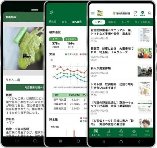 新たに追加された機能の一つが「病害虫画像診断」です。ユーザーは、スマートフォンで撮影した農作物の写真をアプリにアップロードするだけで、AIが病気や害虫を判定します。さらに、特定の症状に対する有効な農薬情報も提供され、農作物の健康管理に大いに役立ちます。この機能は、トマトやブドウ、イチゴなど、合計12品目に対応しています。