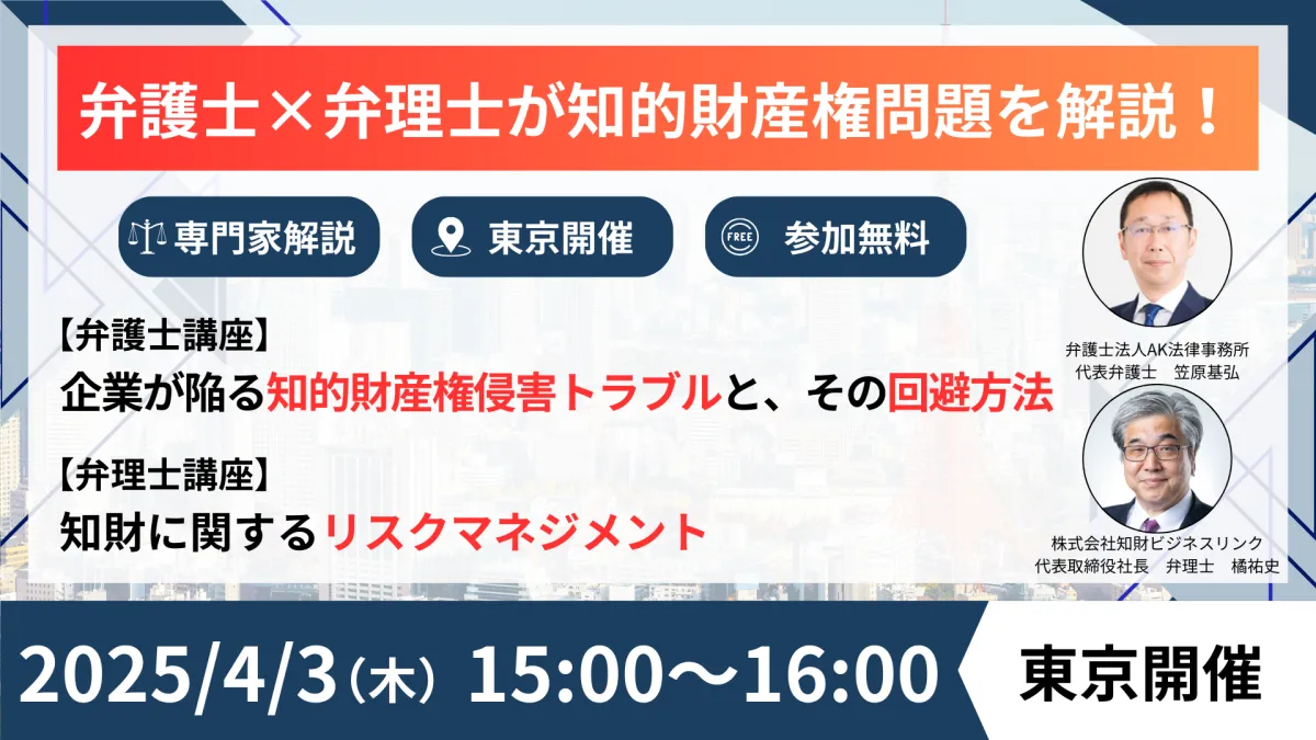 本セミナーでは、法律の専門家である弁護士と弁理士が過去の事例をもとに、企業が直面しがちな知的財産権侵害の要件や予防策を分かりやすく解説します。また、自社ブランドの保護や成長を支えるための具体例に基づいた戦略についても詳しくお話しします。このセミナーに参加することで、知的財産リスクを正しく理解し、実践可能な対策を講じることができるようになるでしょう。