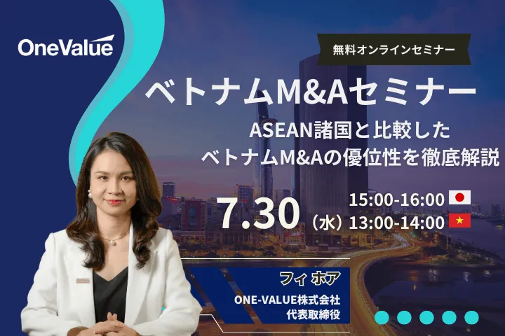 2025年7月30日(水)15:00から、ONE-VALUE株式会社による無料のウェビナーが開催されます。本ウェビナーでは、ベトナムを中心にASEAN諸国でのM&A事情について詳しく解説します。特に、ベトナムの経済的魅力や、どのように日本企業が同国に進出するかに焦点を当てています。