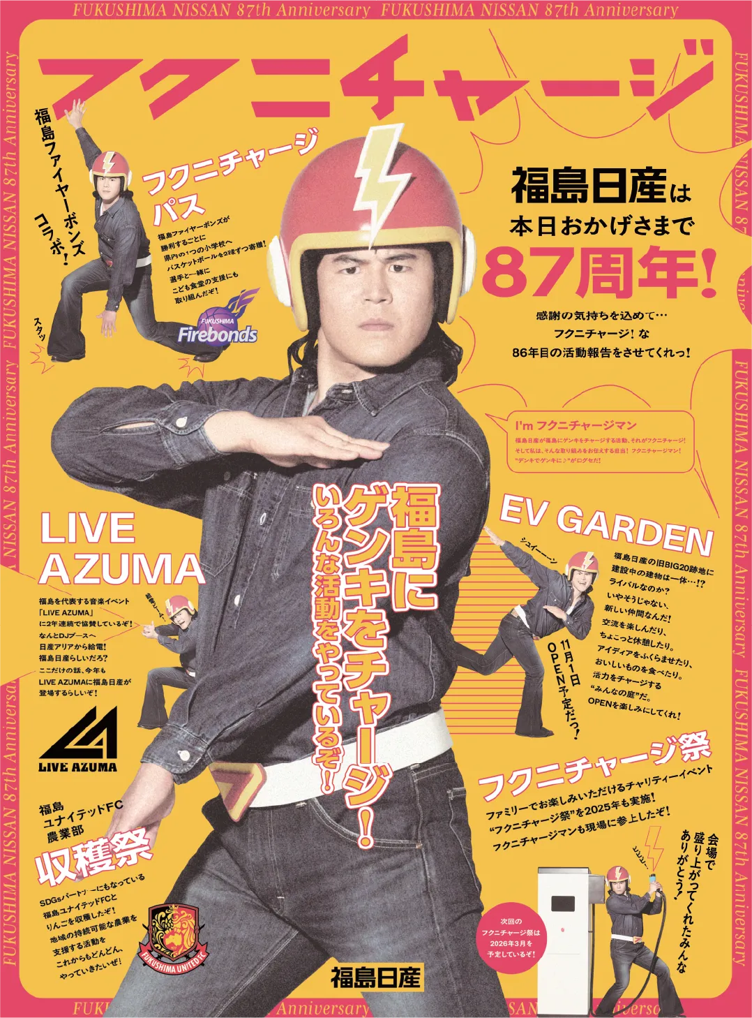 「フクニチャージマン」は、福島日産の独自キャラクターとして、地元の人々に親しまれています。2025年8月に福島民報に掲出されたこの広告は、キャッチーな掛け言葉「フクニチャージ!」とともに、地域の取り組みを楽しく表現しています。審査員からは「インパクトがあり、面白い」との評価があり、地域のニーズを捉える広告として高く評価されました。