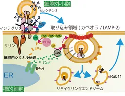本研究では、細胞外小胞がどのように標的細胞に取り込まれるかについて、特にその非依存性という珍しいメカニズムに焦点を当てました。細胞外小胞には、同じ細胞から放出されるにもかかわらず、膜の物理的特性や含まれるタンパク質に異なるサブタイプが存在することが確認されています。研究チームは、これらのサブタイプを個別に分析し、すべてが糖鎖結合タンパク質であるガレクチン3を介してクラスリン非依存的に取り込まれることを見出しました。