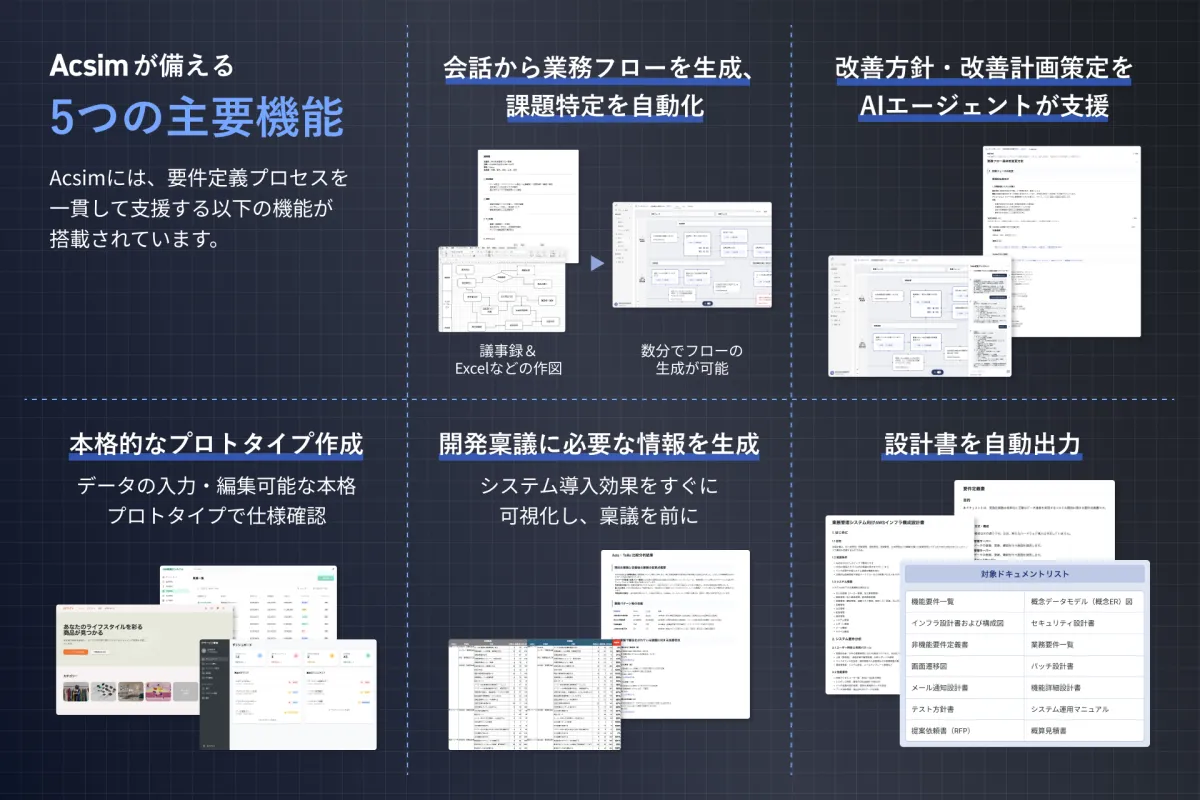 『Acsim』は、構想整理から始まり、課題抽出、改善方針の提示、プロトタイプの生成、設計書の自動出力、さらには開発稟議の支援まで、一連の要件定義プロセスを整然とサポートする生成AIソリューションです。この仕組みにより、要件定義のプロセスは属人性から解放され、高速かつ高品質な設計が可能になります。