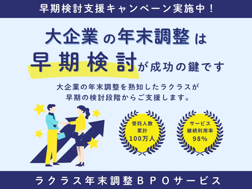 ラクラス株式会社は、2026年度の年末調整BPOサービスの受付を開始し、早期検討支援キャンペーンを実施しています。本サービスは、大規模企業の年末調整業務を軽減することを目的としたアウトソーシングソリューションで、これまでに100万人以上の年末調整業務を担当してきた実績があります。
