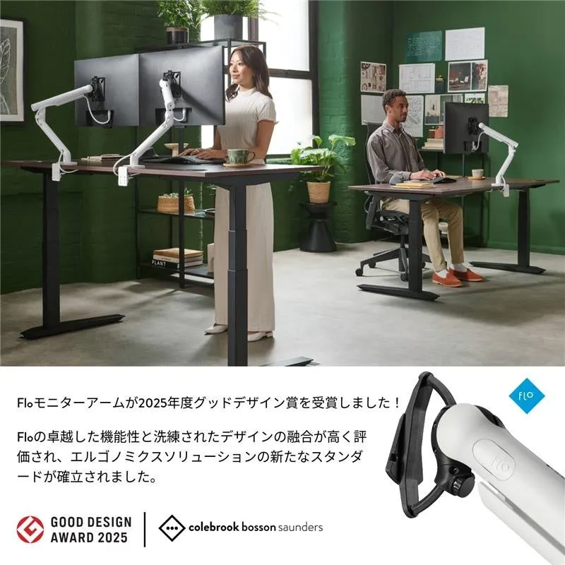グッドデザイン賞の審査委員からも高い評価を受けており、Floモニターアームはフラットモニターから湾曲モニターまで対応し、快適な姿勢と集中力を支えるためのエルゴノミクス設計が施されています。また、簡単に調整できる特許技術が、使いやすさと視覚的な洗練さを両立しています。