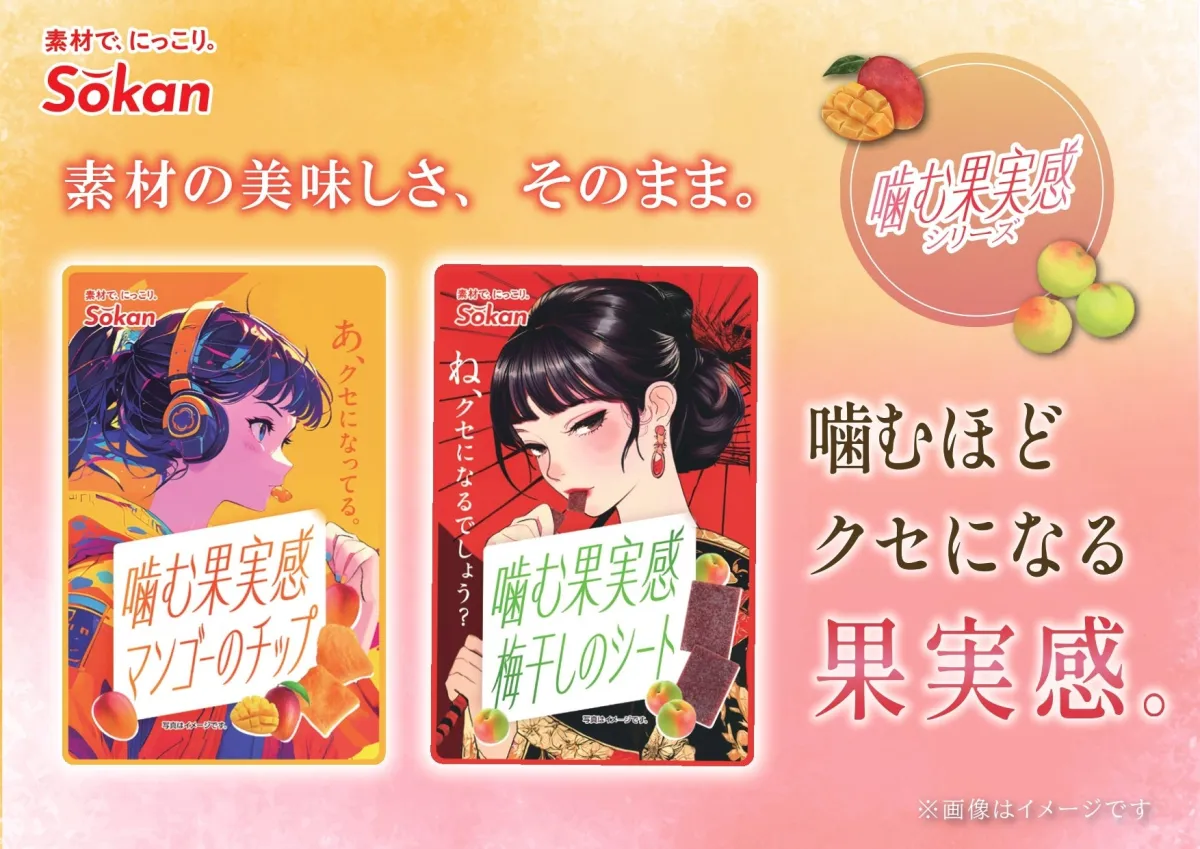 株式会社壮関が2026年2月23日(月)より、新たに展開するスナックシリーズ『噛む果実感マンゴーのチップ』と『梅干しのシート』が発売されます。これらの商品は、全国のコンビニエンスストアやスーパーマーケット、および壮関のオンラインショップで購入可能です。最近の“グミブーム”を背景に、手軽に味わえる間食として、特に注目されています。