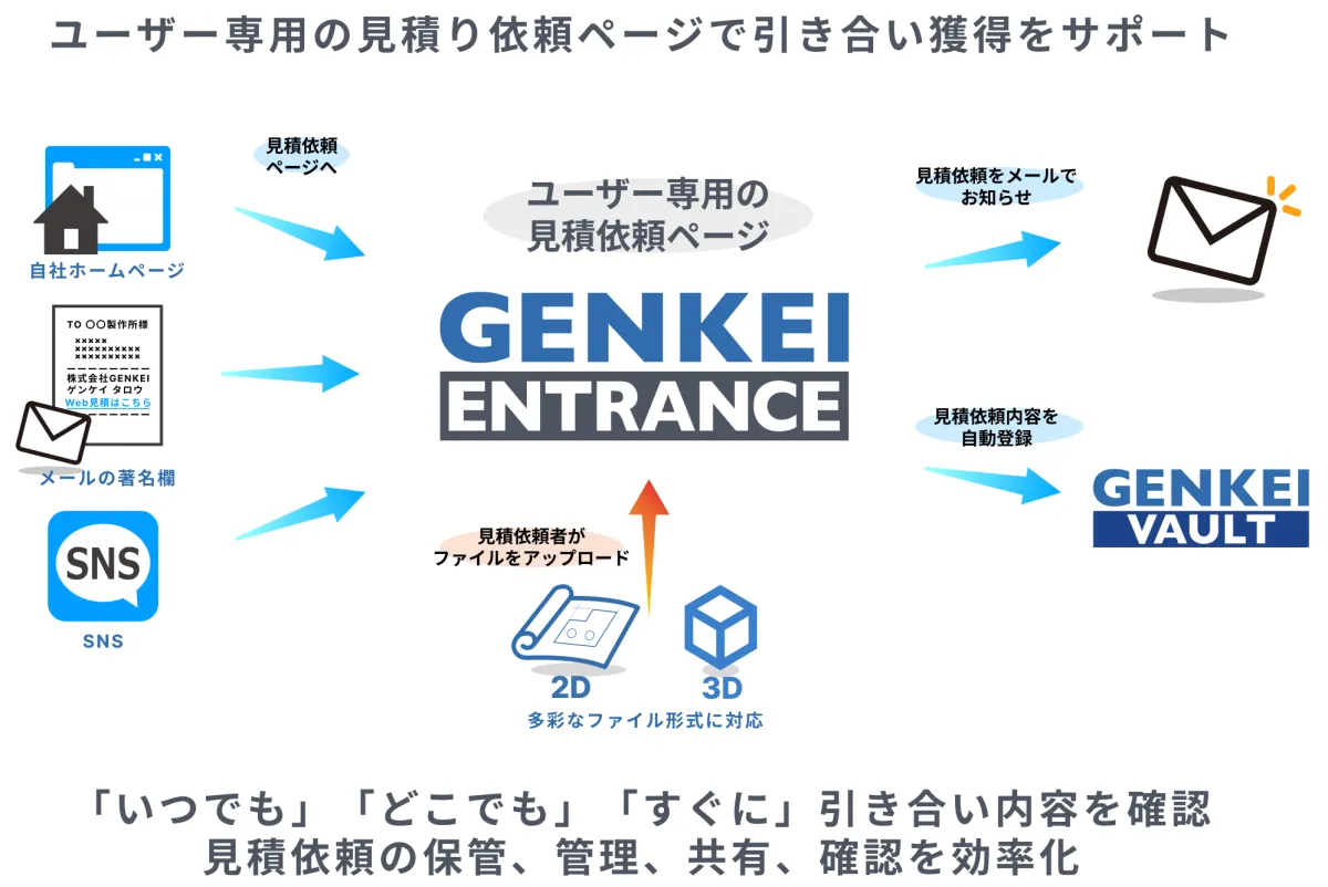 「GENKEI ENTRANCE」は、その操作が簡単で、すぐにユーザー専用のWeb見積依頼ページを作成できます。このページは独立した形で公開でき、自社のウェブサイト、メール署名、SNSなどにリンクを設置することで多様な集客が期待できるのが特徴です。また、依頼された引合いは自動的に「GENKEI VAULT」に登録され、引合いの見逃しを防ぎ、迅速な情報管理が可能となるため、営業活動が大幅に効率化されます。