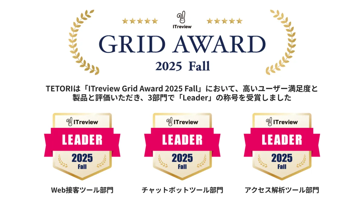最近、Web接客ツール『TETORI(テトリ)』が「ITreview Grid Award 2025 Fall」において、3つの部門で『Leader』に選ばれました。この賞は、法人向けソフトウェアやクラウドサービスのレビューを元にしたもので、特にユーザーからの高い評価が必要です。