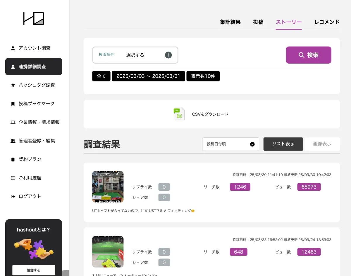 株式会社hashoutは「新たな価値を生み出すソリューションを創る」という理念のもと、SNSの効果測定に関わる分野に特化した事業を展開しています。社名の「hashout」は、「徹底的に対話し解決する」という意味を持っており、確かなコミュニケーションを通じて新しいアイディアを創出することを目指しています。ぜひ、この新しいストーリーズ分析機能を活用し、あなたのInstagramマーケティングを次のレベルへ引き上げてください。