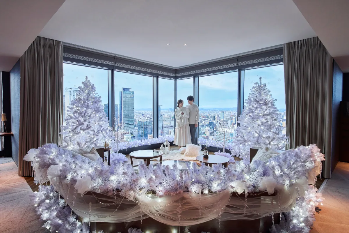 客室には、高さ2メートルを超える真っ白なクリスマスツリーや、白樺の装飾、雪の結晶をデザインしたアイテムなどが施され、まるで雪に包まれた幻想的な世界にいるかのような気分に浸れます。窓から見える名古屋の夜景は、まさに美しいイルミネーション。冬ならではの特別な体験をお楽しみいただけることでしょう。