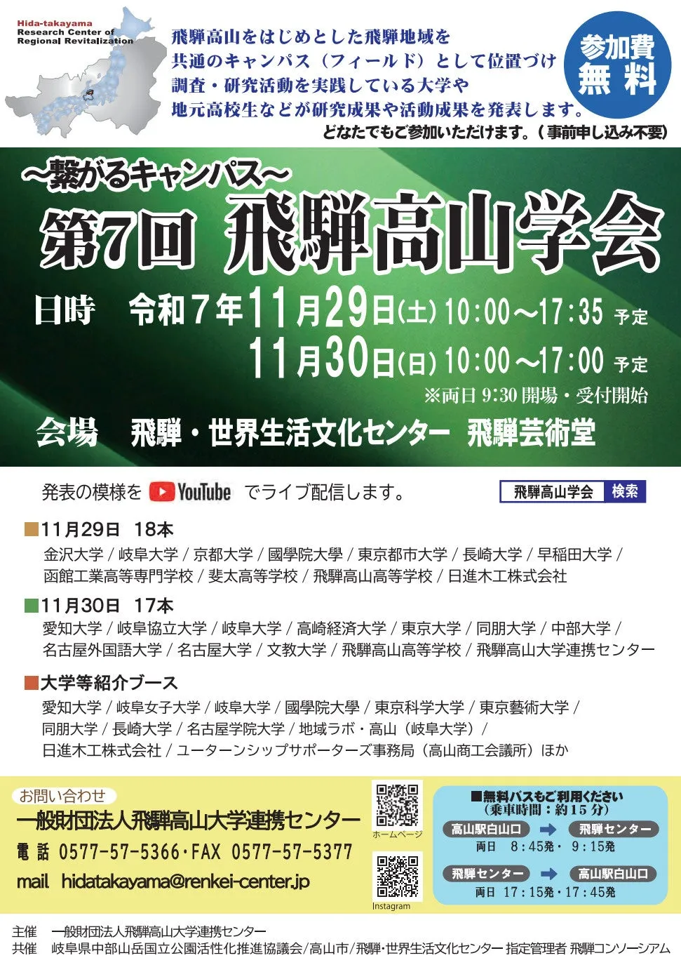 岐阜県高山市に位置する飛騨高山大学連携センターが主催する「~繋がるキャンパス~第7回飛騨高山学会」が、2025年11月29日と30日の2日間にわたって開催されることが決定しました。この学会は、飛騨地域を共通のフィールドとして、全国の大学生や地域の高校生が集まる学術交流のイベントです。参加者たちは、地域課題の解決を目指して行った研究や活動の成果を発表します。