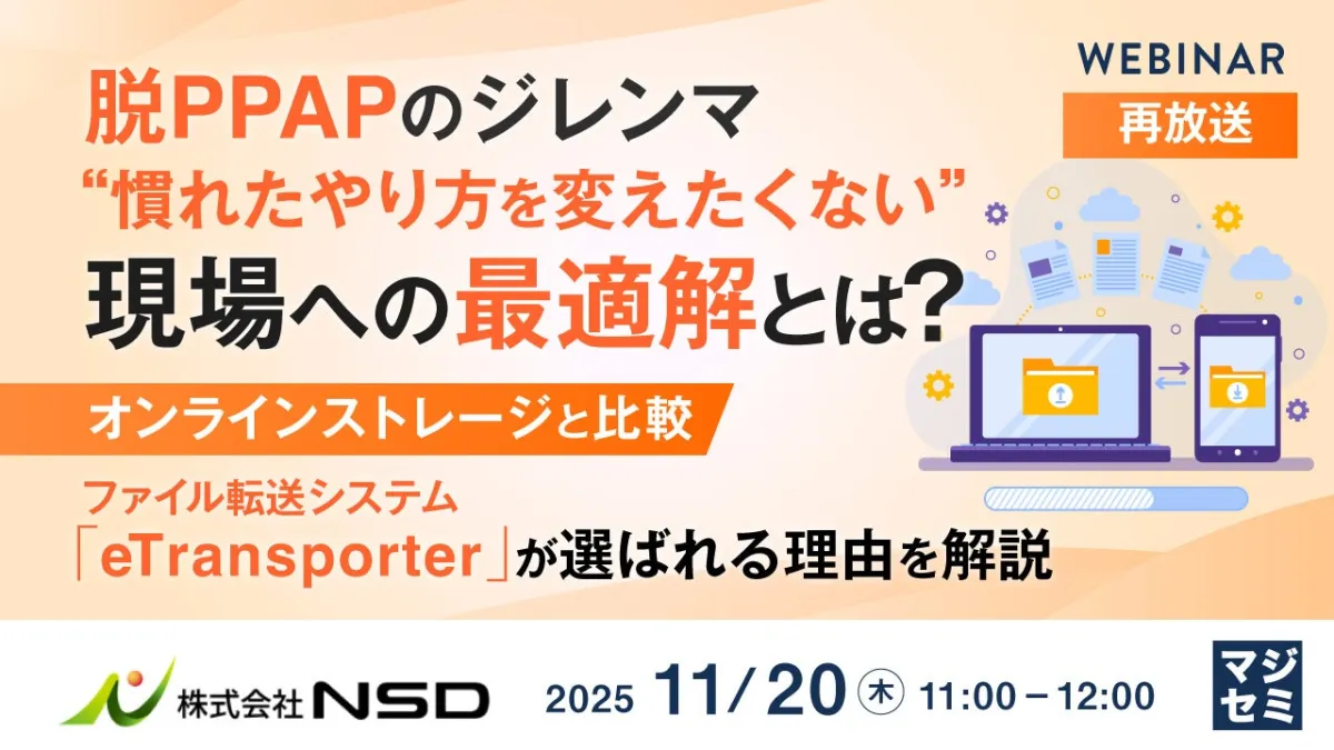 この度、株式会社NSDが主催するウェビナーでは、「脱PPAPに本腰を入れられない」と悩む情報システム部門やセキュリティ担当者を対象に、脱PPAPの具体策を拾い上げます。PPAPの代替手段として注目される「オンラインストレージ」と「ファイル転送」の特徴に触れ、特にファイル転送システムを導入することで得られる利点を詳しく解説します。これからのビジネス環境において、どのようにしてファイル転送システムに移行すればよいか、その手軽さをお伝えすることを目的としています。